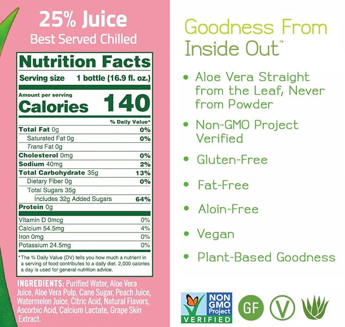 - ALO COMFORT - IT'S JUST PEACHY TO DRINK WATERMELON: ALO real aloe vera juice and pulp harvested straight from the leaf combined with sweet, summery watermelon and peach; Gluten ; Vegan natural aloe drink