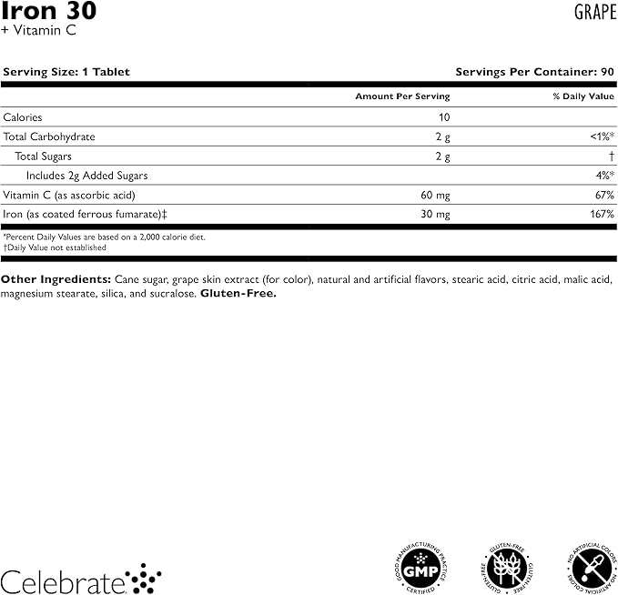 Celebrate Vitamins Iron Supplement with Vitamin C - 30mg Iron, 60mg Vitamin C, Bariatric Vitamins for WLS Patients, Vertical Sleeve & Gastric Bypass Surgery – Grape, 90 Chewable Tablets