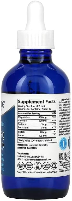 - MEGA MAGNESIUM – 400 mg per serving of high potency, rich, natural, bioavailable concentrated liquid magnesium chloride powered by Concentrace - full spectrum ionic trace minerals