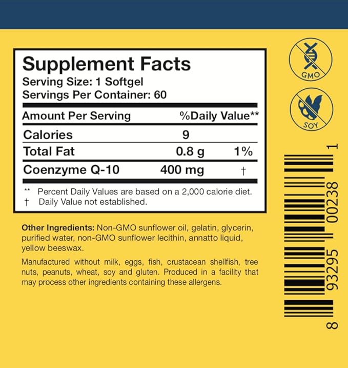 - Non-GMO & Gluten-Free - CoQ10 nutritional supplements manufactured without milk, eggs, fish, crustacean shellfish, tree nuts, peanuts, wheat, soy and gluten. Produced in a facility that may process other ingredients containing these allergens.