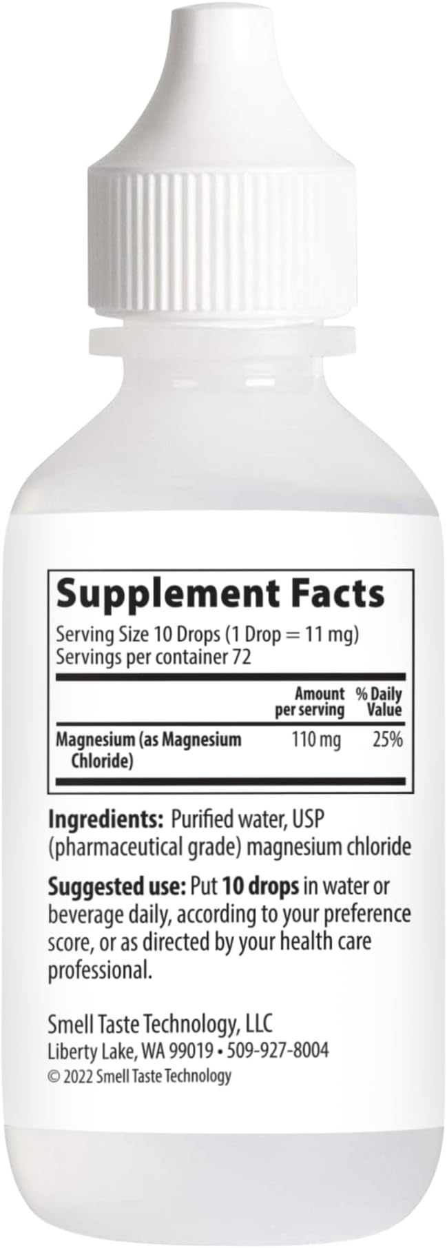 - 110 mg Magnesium per 10 drops (1 Drop = 11 mg) Suggested Use: Add 10 drops in water or beverage of choice. 72 Servings per 2 oz container.