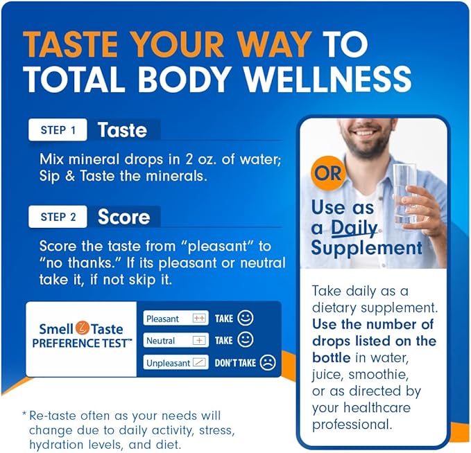 - TASTE N’ SCORE: Add 10 drops to 2 oz of water and use your natural built-in navigation system to guide your health. Taste good to mild? Take it. Not so good? Don't take it. Take the minerals your body is asking for by a simple taste test. Reassess often. Your needs change due to diet, activity and stress.