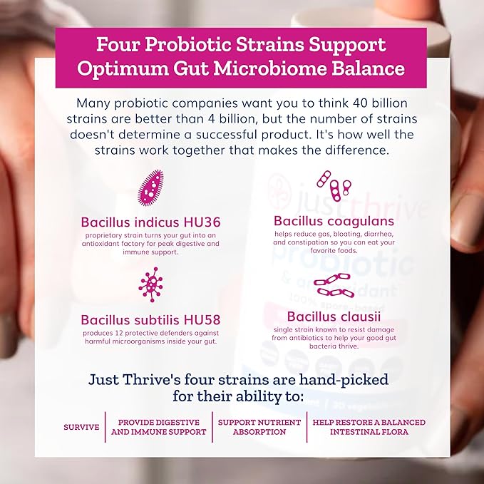 - Spores Support Immune and Digestive Health: Most probiotic products fail to survive and reach the gut. The spores in Just Thrive Probiotic have enhanced digestive and immune health for over 50 years because they reach the gut alive. Spores increase your gut’s microbial diversity for benefits that include encouraging stable immune activity, regulating bowel movements, and restoring gut function.