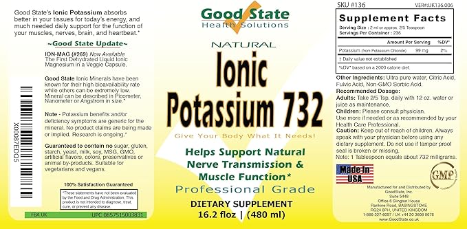 - HIGH ABSORPTION: Good State's liquid potassium supplement, with its ionic mineral properties, facilitates effortless absorption and utilization by the body. By reducing the energy required for particle movement, our potassium drops swiftly enter the bloodstream upon ingestion.