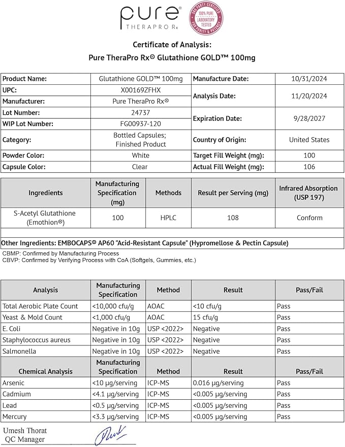 Pure Therapro Rx S-Acetyl Glutathione Gold 100mg, Made in USA - 4 Month Supply | Acid Resistant Capsules | Patented Acetylated Form of Glutathione | Zero Fillers, Pharmaceutical Grade, Non GMO