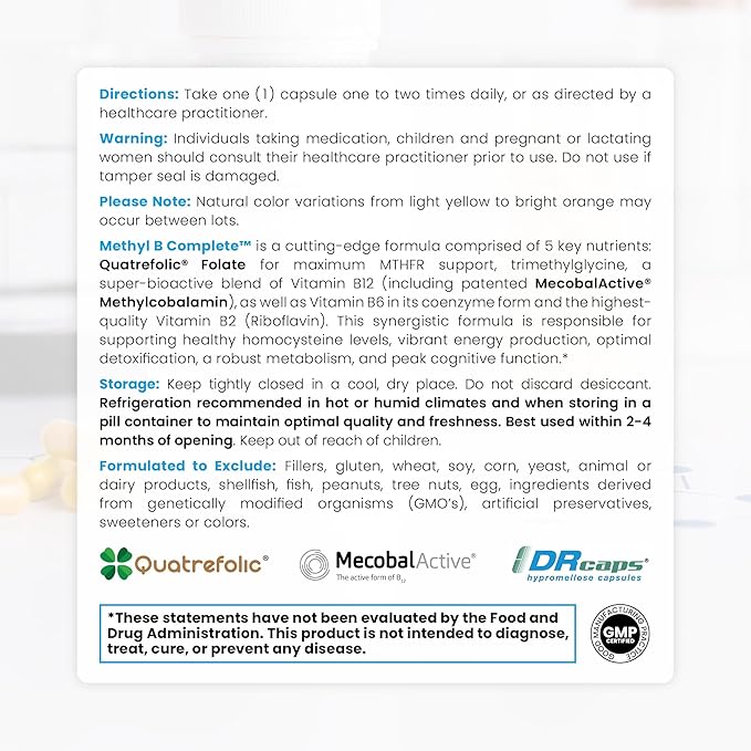 Methyl B Complete - 60 Vegetable Capsules | Optimal Methylation Support Supplement with Quatrefolic 5-MTHF (Active folate), Methylcobalamin (Active B12), B2, B6, and TMG | Pharmaceutical Grade