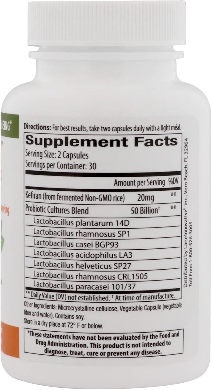 Lane Innovative - Kefiran, Vegetable Capsules, Kefir Nutrient + 50 Billion Active Probiotic Cultures, Supports Optimal Digestive Health, Gluten-Free (30 Servings)