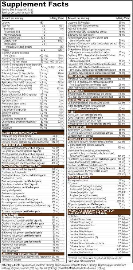 - Made with superfood ingredients to deliver 20 grams of plant protein, antioxidant-rich servings of fruits and vegetables and 25 billion CFU from 12 probiotic strains.
