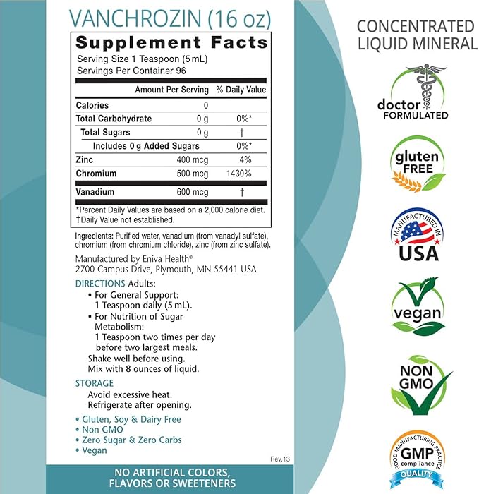 - HEALTHY BLOOD SUGAR & ENERGY SUPPORT FOR LEVELS ALREADY WITHIN NORMAL RANGE - Eniva Health VANCHROZIN is a specialized liquid multi-mineral supplement containing chromium, vanadium and zinc designed to support healthy sugar levels already within normal limits.