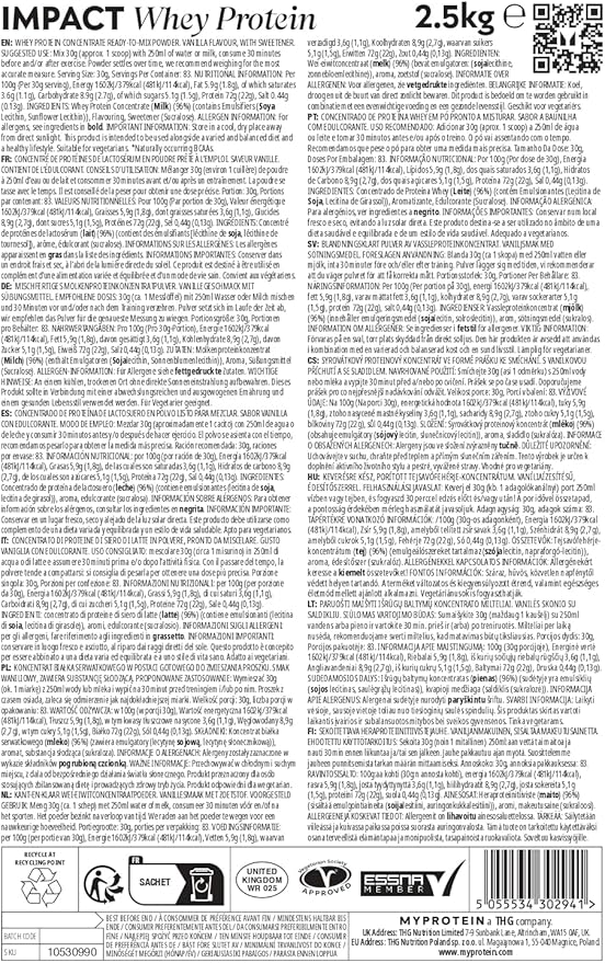 Myprotein Impact Whey Protein Powder, 5.5 Lbs (100 Servings) Vanilla Ice Cream, 22g Protein & 5g BCAA Per Serving, Protein Shake for Superior Performance, Muscle Strength & Recovery, Gluten Free