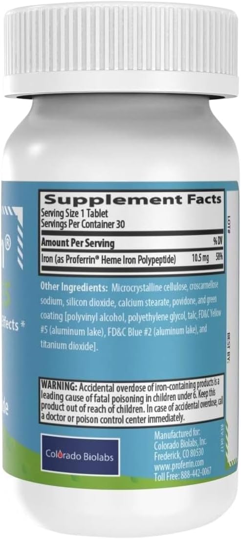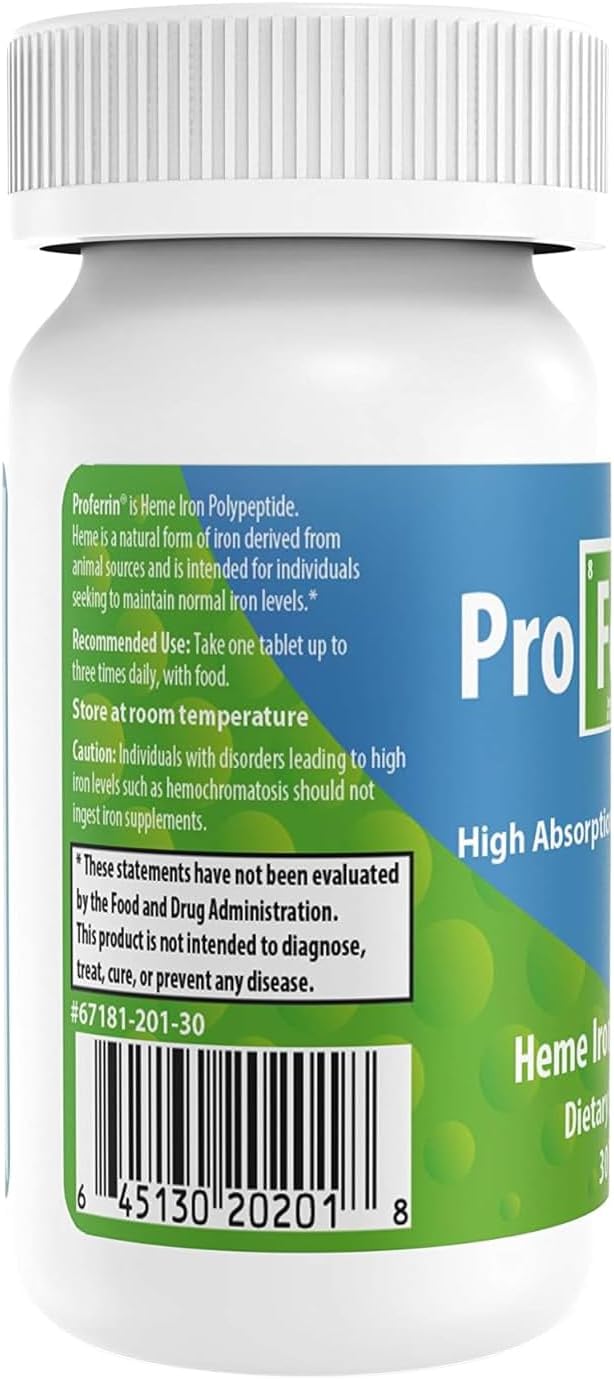 Proferrin ES- 10.5mg of high Absorbing Heme Iron Polypeptide. Made in The USA. 30 Tablets. Easy on The Gut. Not affected by Coffee, Calcium, or PPI's.