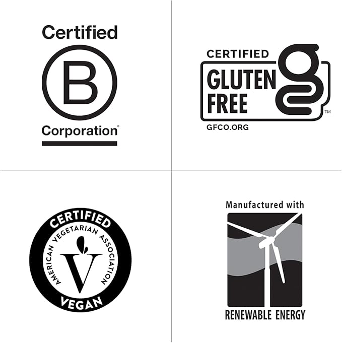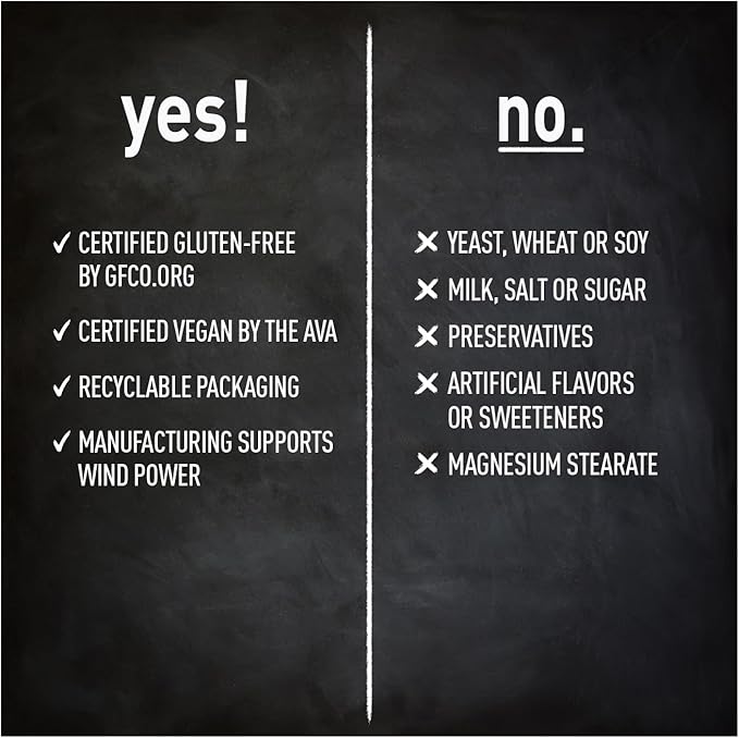 - Responsibly made - Certified Glute Free, Vegan, made with recyclable packaging the manufacturing of this product supports wind power. This product does not contain yeast, corn, wheat, soy, milk, preservatives or artificial colors, flavors or sweeteners.