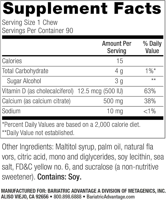 - Sugar-Free Chews: Each Bariatric Advantage chew is individually wrapped and sugar-free, making them easy to take on the go and an ideal choice for a chewable calcium supplement with no additional sugar content