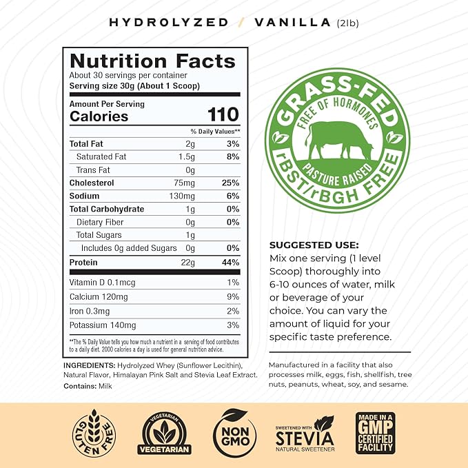 - PURE INGREDIENTS: Natural hydrolyzed whey protein concentrate is gluten-free, keto-friendly, and comes from pasture-raised happy cows. This clean hydro protein powder contains no fillers or artificial flavors and contains all the essential amino acids for optimal protein synthesis.