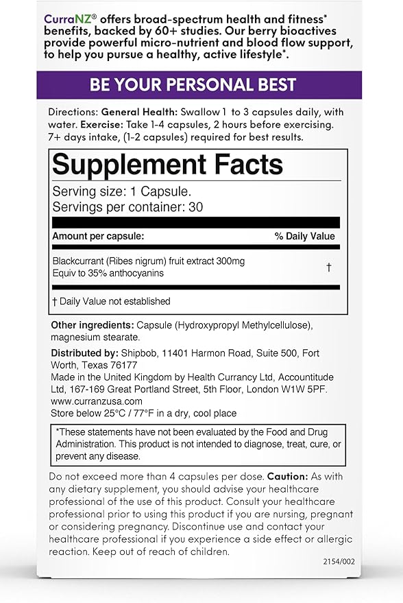 - Our capsules are not to be confused with blackcurrant oil. Each CurraNZ capsule contains a maximum-strength 35% anthocyanin extract, with one serving providing the equivalent of 30,000mg fresh fruit or 105mg anthocyanin, the equivalent of a generous handful of fresh New Zealand blackcurrants.