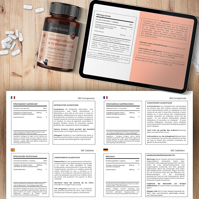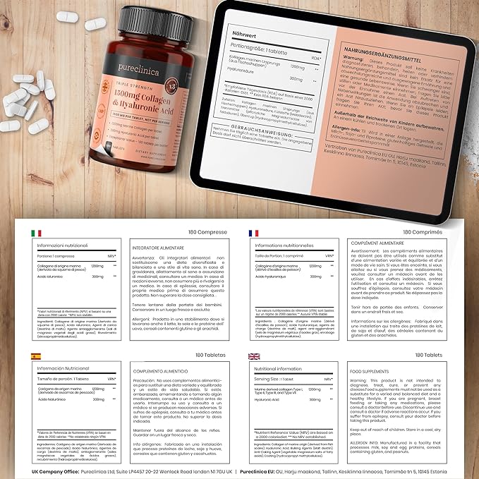 - 1200mg collagen and 300mg Hyaluronic Acid per 1500mg tablet