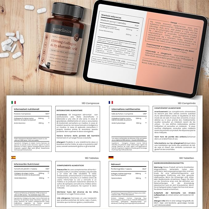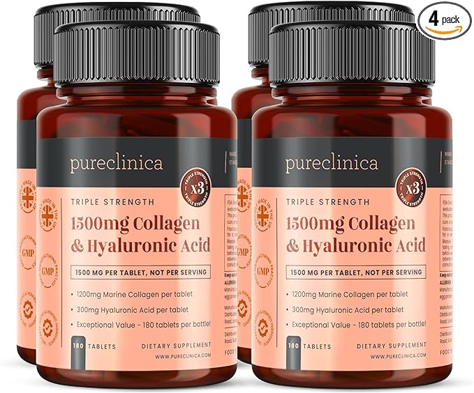 pureclinica Triple Strength Marine Collagen & Hyaluronic Acid – 1500mg per Tablet | 720 Tablets (4 Bottles of 180) | Supports Skin, Joints & Hydration