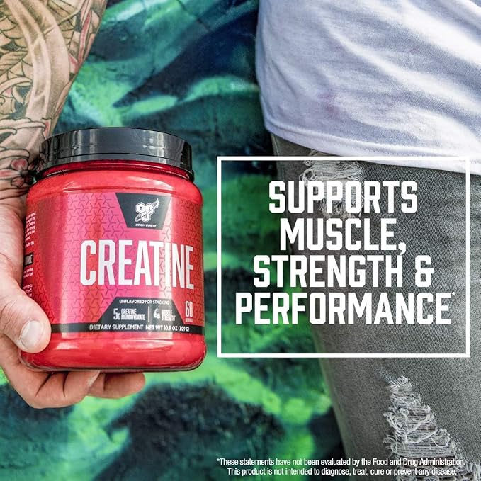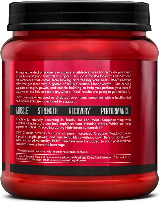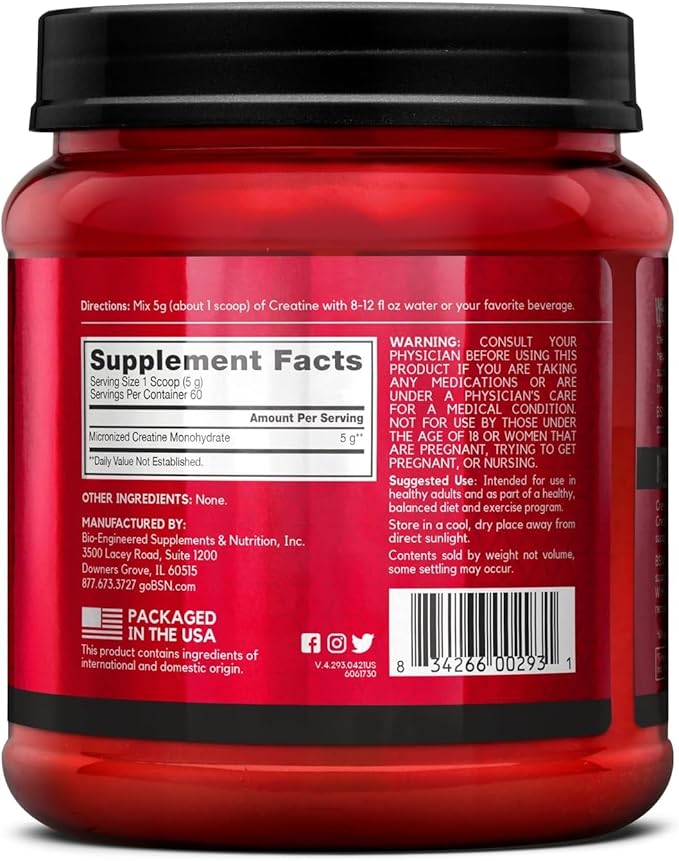BSN Micronized Creatine Monohydrate Powder, Unflavored, 60 Servings, Supports Muscle Strength, 5g (5000mg) per Servings,Pure & Gluten Free, 5g (5000mg) per Servings