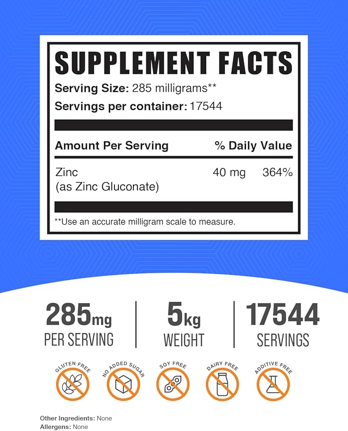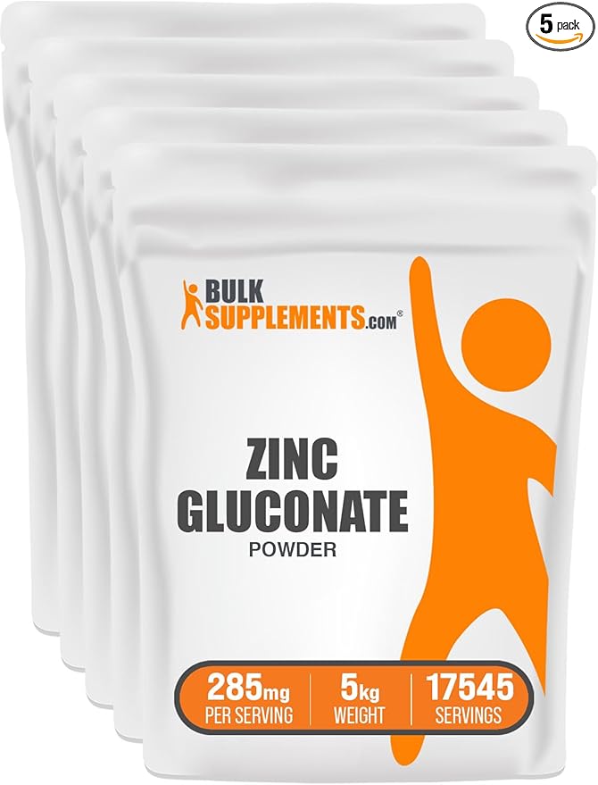 BulkSupplements.com Zinc Gluconate Powder - Zinc 40mg, Zinc Powder - Zinc Supplement for Immune Support - Gluten Free, 285mg per Serving, 5kg (11 lbs) (Pack of 5)