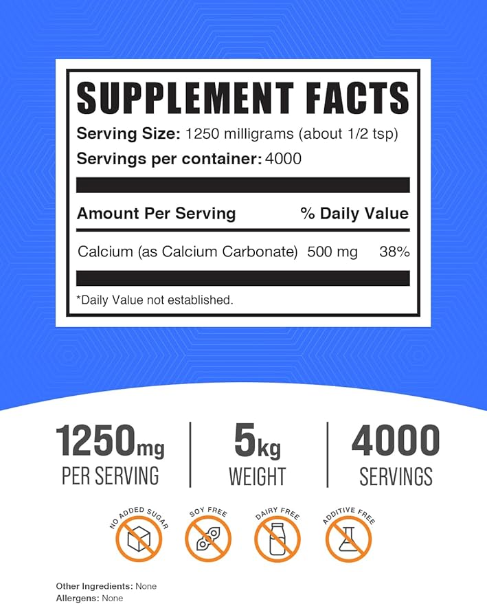BulkSupplements.com Calcium Carbonate Powder - Calcium Carbonate Food Grade, High Absorption - Gluten Free, 1.25g per Serving, 1kg (Pack of 5) (11 lbs)