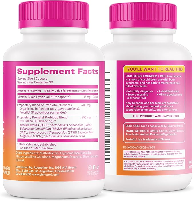 - Pink Stork Prenatal Probiotic is crafted specifically for women looking for targeted pregnancy support throughout all trimesters. Our premium formula includes seven spore-based probiotic strains, Vitamin B6, and Inulin prebiotic fiber to support your body’s natural digestive rhythms. These probiotics for pregnancy are designed to help maintain gut health, microbiome balance, and nutrient absorption — all critical during this time. Whether you’re in the first trimester or preparing for labor, our probiotic blend works in harmony with your prenatal vitamins and overall pregnancy wellness routine. Ideal for expecting moms seeking a trusted prenatal supplement made with quality ingredients.