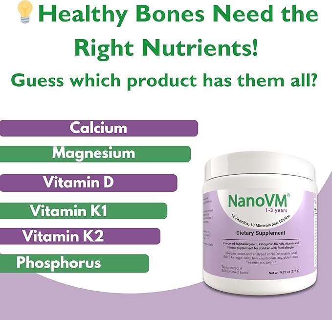 - A Nutrient-Dense Wellness Formula - Our supplement powder is packed with 14 vitamins, 13 minerals, and choline, which provide your kids with the essential nutrients they need to grow and develop. Our vitamin powder also has increased levels of calcium and vitamin D for optimal bone health.