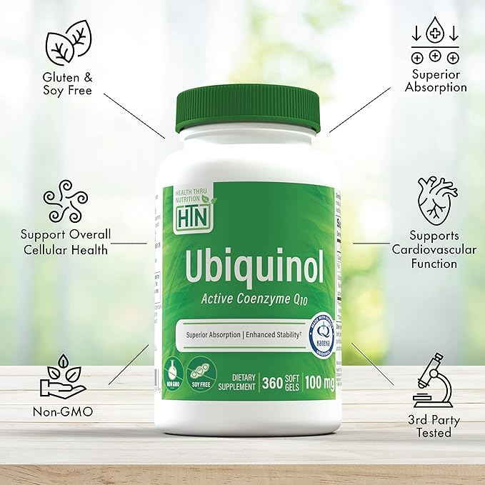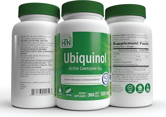 Health Thru Nutrition Ubiquinol 100mg 360 Softgels as Kaneka QH Reduced CoQ-10 | Stabilized - 3rd Party Tested | Enhanced Bioavailability | Cardiovascular & Mitochondria Function Support | Non-GMO