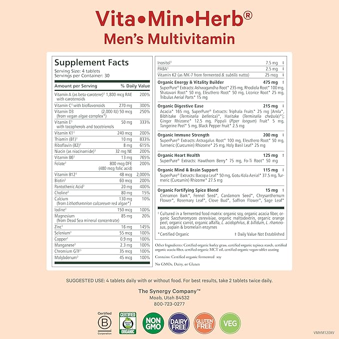 PURE SYNERGY Vita·Min·Herb for Men | Men’s Comprehensive Multivitamin Supplement | Made with Organic Whole Food Non-GMO Ingredients | Daily Energy & Immune Support (120 Tablets)