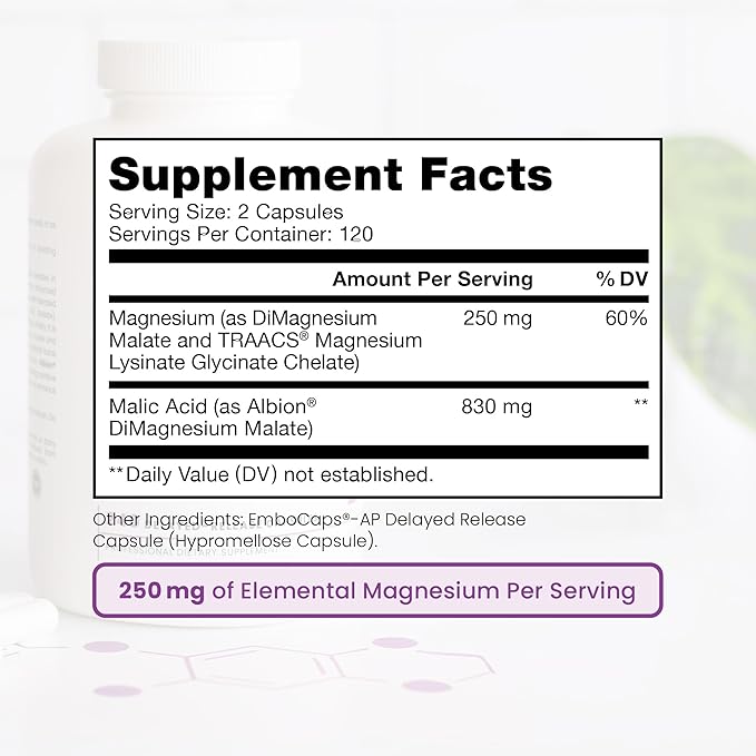 - ππππππππ ππππππππππ: Optimum Magnesium features highly bioavailable, well-tolerated Magnesium Lysinate Glycinate chelate, plus Malic Acid from Di-Magnesium Malate for increased efficacy. To further improve absorption, Optimum Magnesium utilizes EmboCaps for a delayed release of 45 minutes into the small intestine. This delayed release allows for optimal absorption and bioavailability.