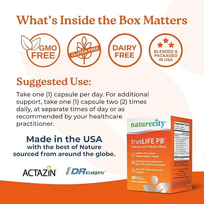 NatureCity True-Life-PB Shelf Stable Blend Prebiotics and Probiotics for Women and Men - Digestive Gut Health Supplements for Women and Men - Dairy Free - (30 Veggie Capsules)