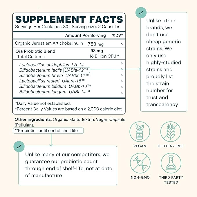 Ora Organic Probiotics with Prebiotics for Digestive Health 16 Billion CFU - Trust Your Gut - Strains - Acidophilus Lactobacillus Breve Bifidum Lactis