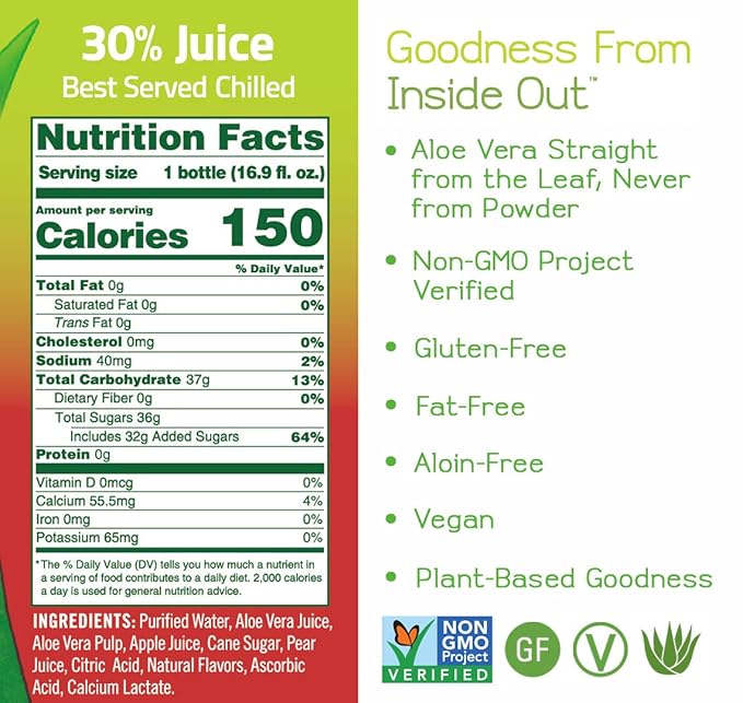 - NATURAL, PLANT-BASED GOODNESS: Real aloe vera juice and pulp straight from the leaf – never from powder; ALO Original drinks are sweetened with real cane sugar; Aloin , Fat and Non-GMO Certified
