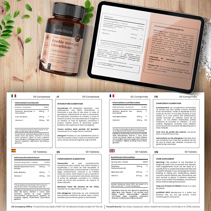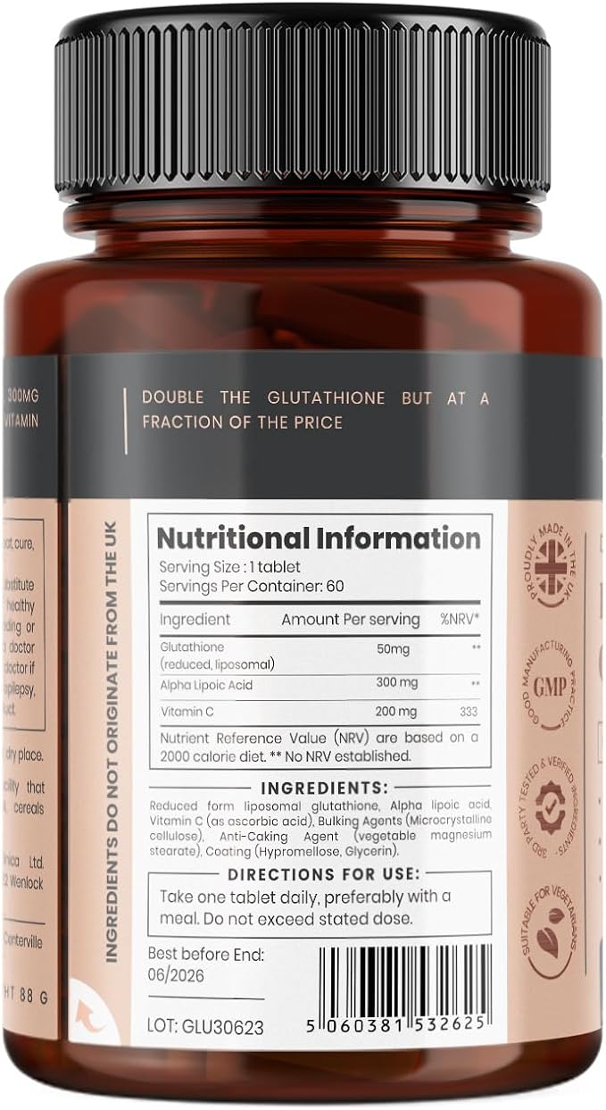 - ✅ High Potency Formula – Each tablet delivers 1000mg of active ingredients: 500mg Reduced Glutathione, 300mg Alpha Lipoic Acid, and 200mg Vitamin C for maximum antioxidant support.