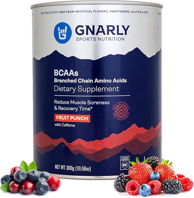 Gnarly Nutrition BCAA Powder, Fruit Punch – Pre-Workout BCAAS Amino Acids – NSF Sport Certified – Supplement to Support and Rebuild Muscle – Fruit Punch with Caffeine, 10.58 oz
