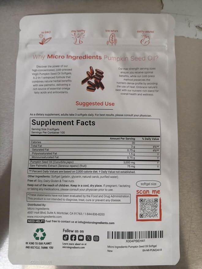 - Micro Ingredients offers max strength virgin pumpkin seed oil softgels, high concentrated cold-pressed ingredients, 2-in-1 complex with saw palmetto extract, retains essential fatty acids, phytosterols, and antioxidants.