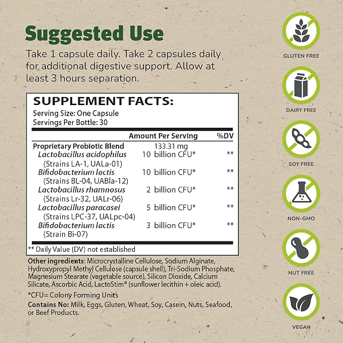 - COLONIZING PROBIOTIC - This supplement contains 30 billion CFU of Lactobacilli and Bifidobacteria probiotic cultures for complete intestinal coverage. The strains work together to promote digestive health, wellness, and a return to regularity.