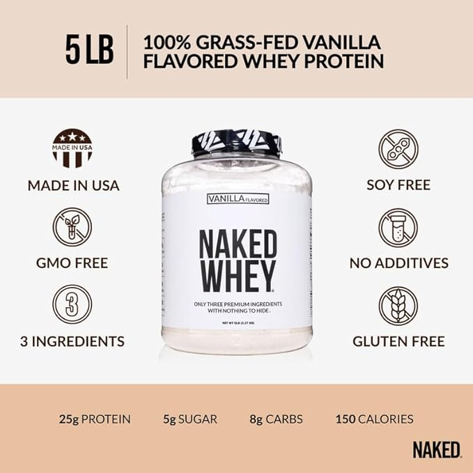 - VANILLA WHEY PROTEIN: Use our grass fed vanilla whey protein powder as the perfect base of subtle flavor to blend with fruits and vegetables to create healthy pre and post-workout protein shakes. Because Vanilla Naked Whey has only 3 ingredients, you can use it to bake high protein recipes such as protein pancakes to take your muscle gains and recovery to new heights.