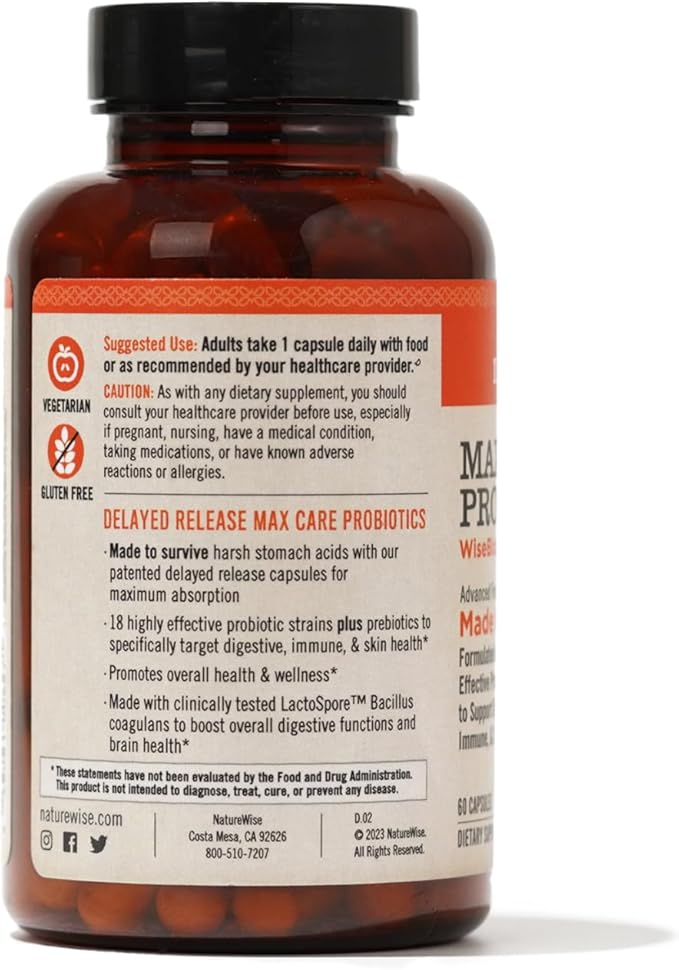 NatureWise Max Probiotics for Women & Men - 30 Billion CFU 18 Strains With Prebiotics - For Gut & Digestive Health - Delayed-Release Capsules, Gluten Free - 60 Capsules[2-Month Supply]