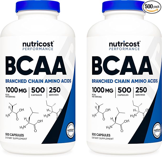 Nutricost BCAA 1000mg, 500 Capsules (250 Serv), 2:1:1 Branched Chain Amino Acids (500mg of L-Leucine, 250mg of L-Isoleucine and L-Valine) (2 Bottles)