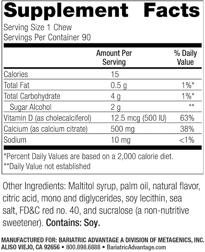 - Sugar-Free Chews: Each Bariatric Advantage chew is individually wrapped and sugar-free, making them easy to take on the go and an ideal choice for a chewable calcium supplement with no additional sugar content