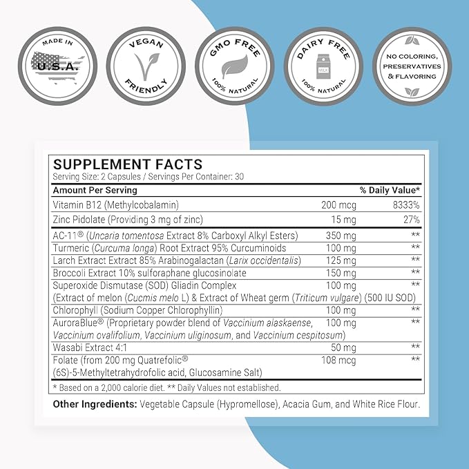- Recommended Use - Take 2 capsules a day. Store out of direct sunlight in a cool, dark place to maintain maximum effectiveness. Contains: AC-11, broccoli extract (10% sulforaphane glucosinolate), larch extract (85% arabinogalactans), curcuma longa extract (95% curcuminoids), SOD-Gliadins complex (melon extract), chlorophyll, AuroraBlue, wasabi extract, Zinc picolate, Methylcobalamine, Quatrefolic (6S)-5-methyltetrahydrofolate glucosamine salt | Other ingredients: acacia gum, white rice flour.