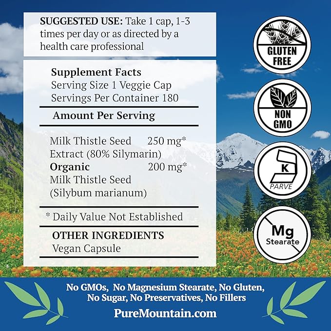 Pure Mountain Botanicals High Potency Milk Thistle -180 Kosher Vegan Capsules with 450mg Organic Milk Thistle Seed and Extract