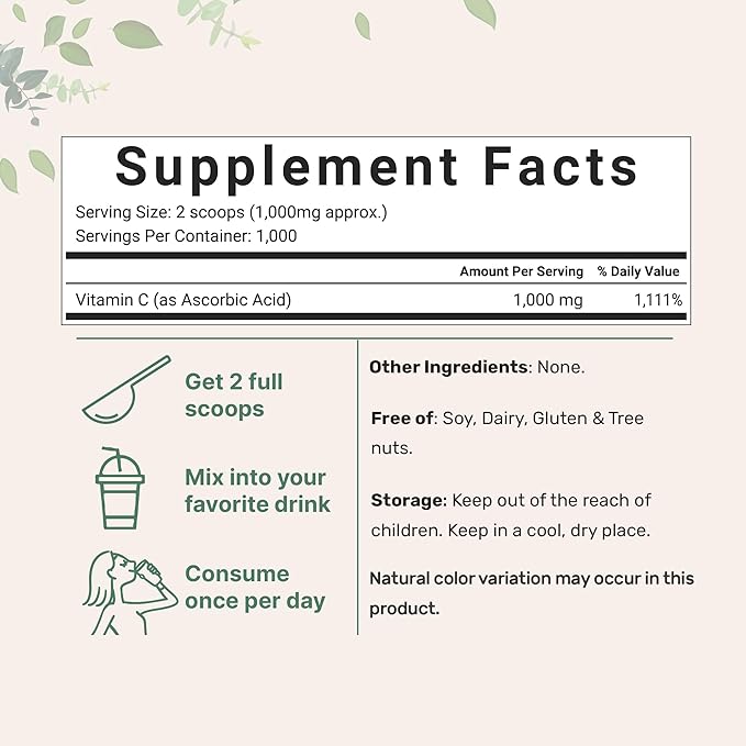 - Pure Ascorbic Acid Supplement (Vitamin C Supplement), 1KG (35 Ounce), Water Soluble, No GMOs.