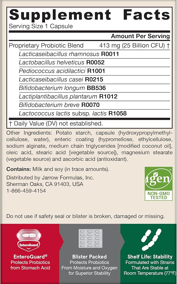 - ENGINEERED TO SURVIVE DIGESTION: Each Jarrow probiotic capsule features EnteroGuard coating, to protect the friendly bacteria from stomach acid and deliver the potency of friendly bacteria needed to support a healthy gut(1)