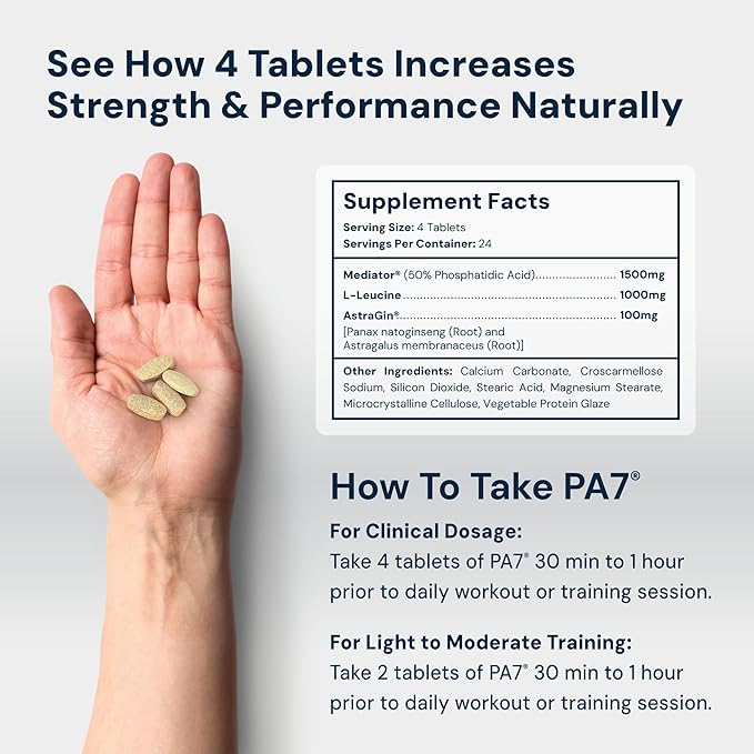 - DIRECTIONS - For Light to Moderate Training; Take 2 tablets per day immediately upon waking or 30 minutes to 1 hour before exercise. Start with this dosage, and increase to the full dosage of 4 tablets per day if desired. For Intense Training; On workout/training days (up to 6 days per week) take 4 tablets of PA(7), 30 minutes to 1 hour before your workout or training session.