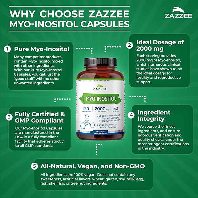 Zazzee Myo-Inositol Capsules, 2000 mg per Serving, 120 Vegan Capsules, Ideal Dosage for 40:1 Ratio, 100% Vegetarian, Hormone Balance & Healthy Ovarian Function Support, All-Natural and Non-GMO