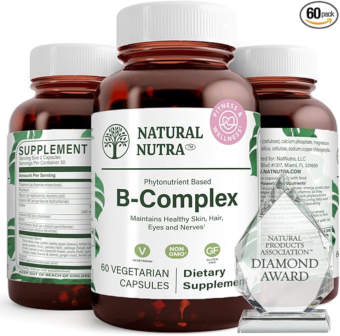 Natural Nutra Vitamin B Complex with Niacin, Folate, Thiamin, Biotin, Supports Nervous System Health, Promotes Metabolism, Skin, Eyes and Hair Health, Whole Food Supplement, 60 Vegetarian Capsules