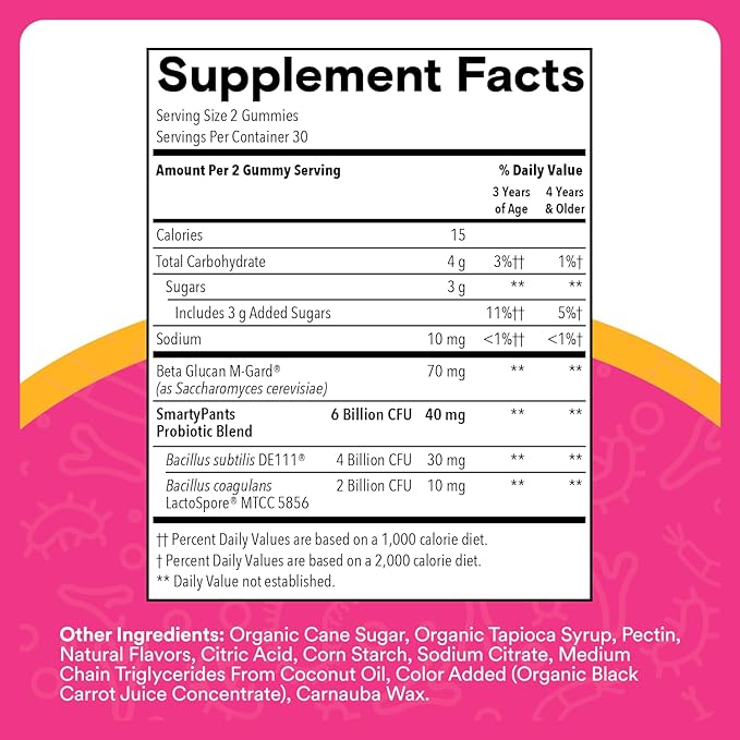 - DELICIOUS TASTE: Strawberry Flavor with Other Natural Flavors. For children 3 years of age or older, take two (2) gummies daily. May be taken with or without food. May be paired with SmartyPants multivitamins.