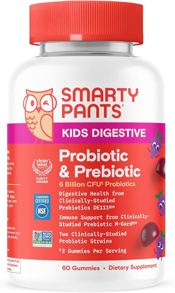 SmartyPants Kids Probiotic & Prebiotic Gummies for Digestive Health: Gut Health Supplement, Clinically Studied Prebiotic for Immune Support, Grape, 60 Count (30 Day Supply)