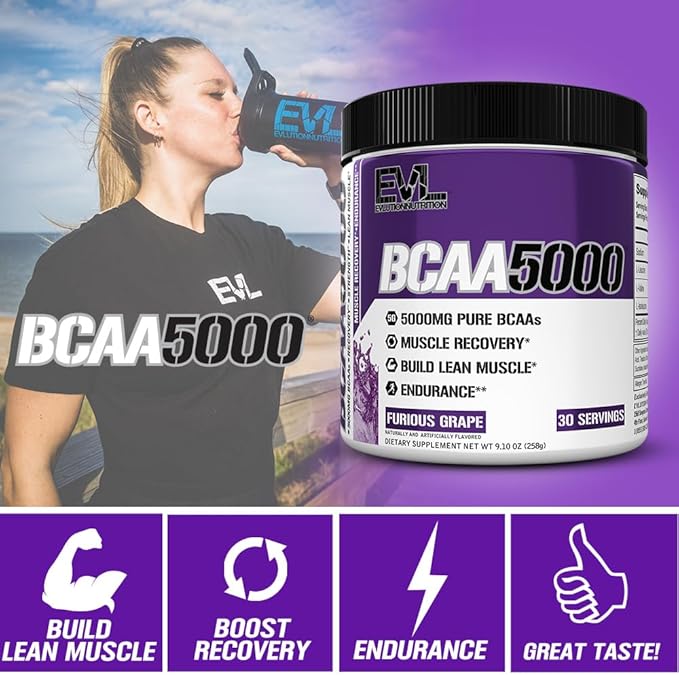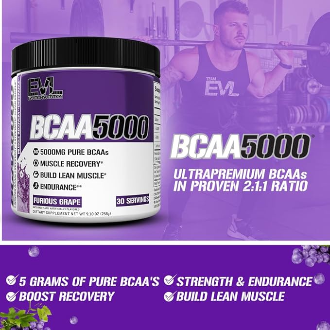 EVL BCAAs Amino Acids Powder - BCAA Powder Post Workout Recovery Drink and Stim Free Pre Workout Energy Drink Powder - 5g Branched Chain Amino Acids Supplement for Men - Furious Grape
